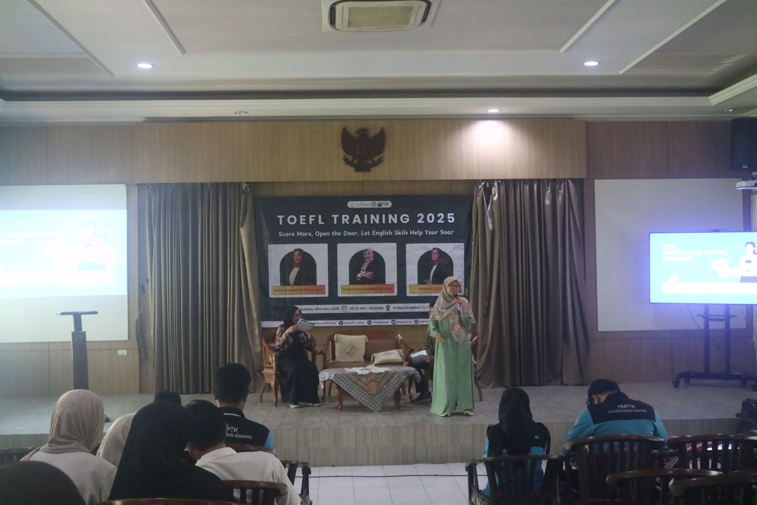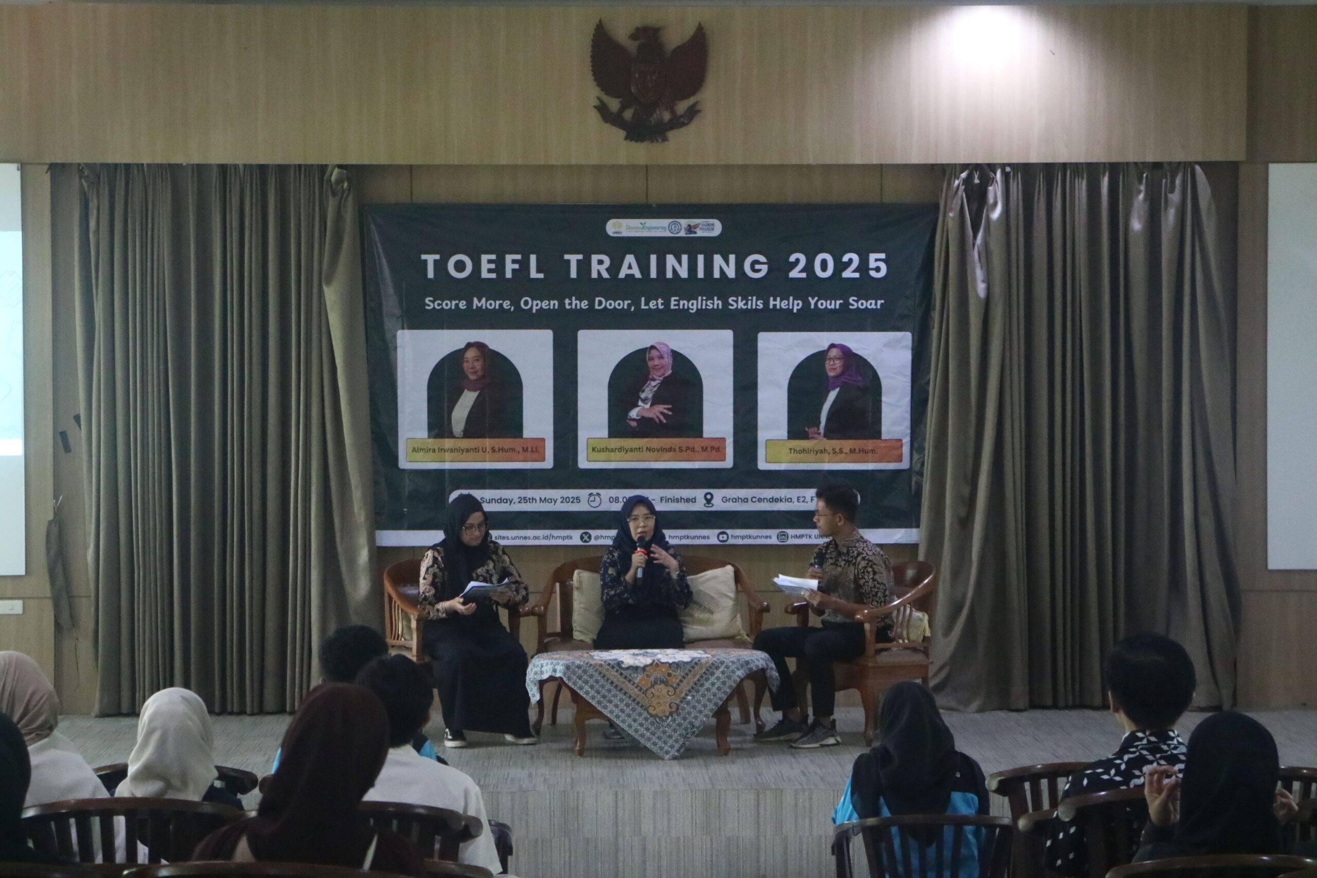 Himpunan Mahasiswa Profesi Teknik Kimia Universitas Negeri Semarang pada hari Minggu, 25 Mei 2025 pukul 08.00 WIB di Ruang Graha Cendikia, Gedung E2 Lt.3, Fakultas Teknik, Universitas Negeri Semarang telah melaksanakan kegiatan TOEFL Training 2025 dengan tema โScore More, Open the Door, Let English Skills,Help You Soarโ. Acara ini dihadiri oleh 70 orang peserta dari berbagai jurusan di Universitas Negeri Semarang dengan pemateri Thohiriyah, S.S.,M.Hum.; Almira Irwaniyanti Utami, S.Hum., M.Li; Kushardiyanti Novinda, S. Pd., M. Pd.