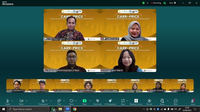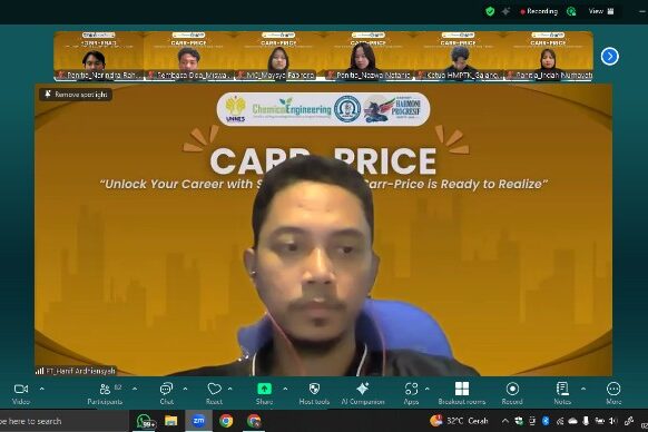 Himpunan Mahasiswa Profesi Teknik Kimia (HMPTK) Universitas Negeri Semarang pada Hari Sabtu, 2 Agustus 2025 telah melaksanakan kegiatan Career Preparation for Chemical Engineer (Carr-Price) 2025 melalui platform ZoomWorkplace dengan tema โUnlock Your Career with Sharp and Wise, Carr-Price is Ready to Realize โ. Acara ini diikuti oleh 120 peserta dari mahasiswa Teknik Kimia angkatan 2021, 2022, 2023, dan 2024.