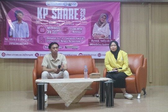 Himpunan Mahasiswa Profesi Teknik Kimia (HMPTK) Universitas Negeri Semarang pada Hari Minggu, 31 Agustus 2025 telah melaksanakn kegiatan KP Share 2025 dengan tema โIgnte Your Motion, Shape Your Devotion With Intership Preparationโ Acara ini diikuti oleh 90 peserta dari mahasiswa Teknik Kimia Angkatan 2023, dan 2024.