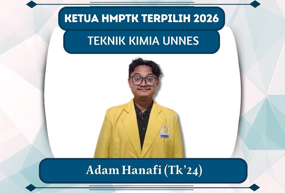 Selamat kepada Adam Hanafi (Teknik Kimia 2024) atas terpilihnya menjadi Ketua Umum HMPTK 2026 melalui Pemira 2025 Fakultas Teknik, Universitas Negeri Semarang.