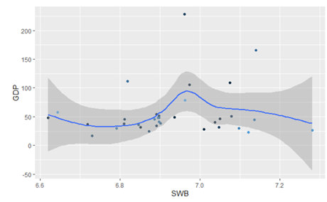 Empat dekade kemudian, Easterlin menguji kembali temuan ini pada 37 negara dan hasilnya tetap konsisten: pertumbuhan GDP per kapita tidak berkaitan dengan perubahan jangka panjang pada life satisfaction (Easterlin et al., 2010). Seperti yang terlihat pada grafik berikut, garis tren antarnegara hampir datar. menunjukkan bahwa ekonomi dapat tumbuh 5-9% per tahun, tetapi kebahagiaan warganya tidak otomatis bergerak naik.