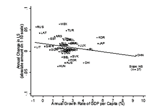 Gambar 1. Pertumbuhan GDP per kapita vs perubahan life satisfaction (37 negara)
