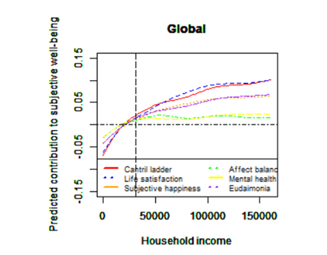 Paradoks ini menjadi semakin menarik ketika dibandingkan dengan riset-riset SWB mutakhir. Studi global (Tsurumi & Managi, 2025) menunjukkan bahwa hubungan pendapatan dan SWB sangat bergantung pada indikator SWB yang digunakan. Untuk life satisfaction dan cantril ladder, pendapatan memang berhubungan positif, tetapi hanya sampai titik tertentu. Grafik berikut menunjukkan bagaimana kontribusi pendapatan terhadap berbagai indikator SWB cenderung flattening pada level pendapatan menengah, dan hampir datar pada pendapatan tinggi, terutama untuk affect balance dan kesehatan mental.