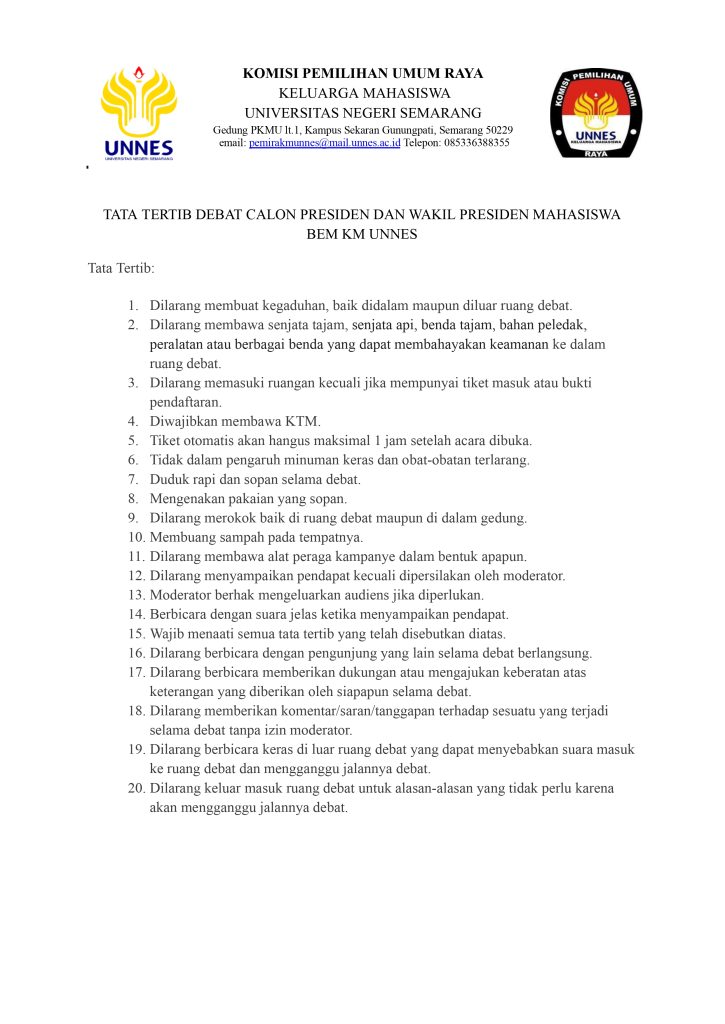 Pendaftaran peserta debat pasangan calon Presiden Mahasiswa dan Wakil Presiden Mahasiswa BEM KM UNNES 2024 dapat dilakukan melalui tautan berikut :